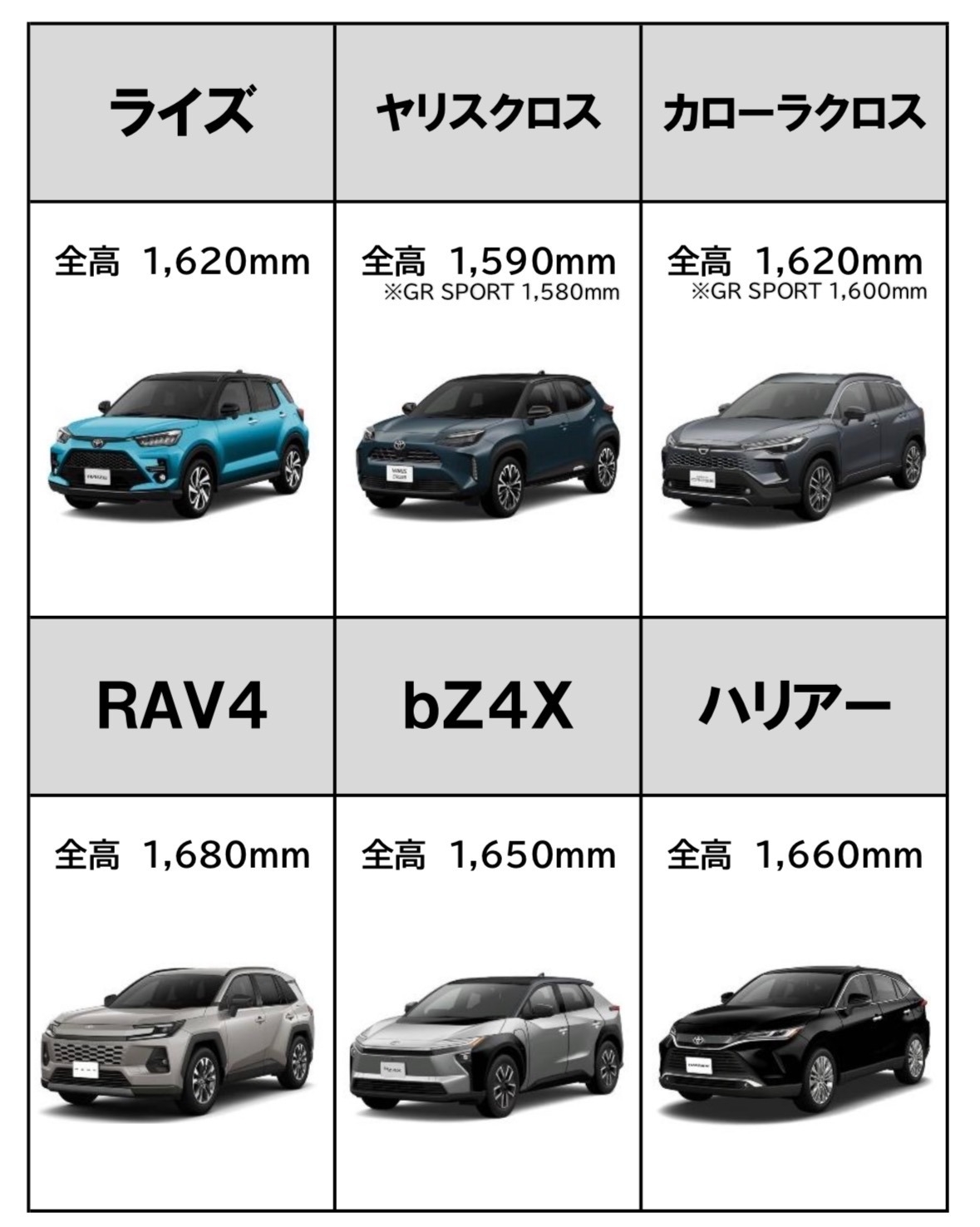 SUVのライズ・ヤリスクロス・カローラクロス・RAV4・bZ4X・ハリアーの6車種で大きさを比較してみました