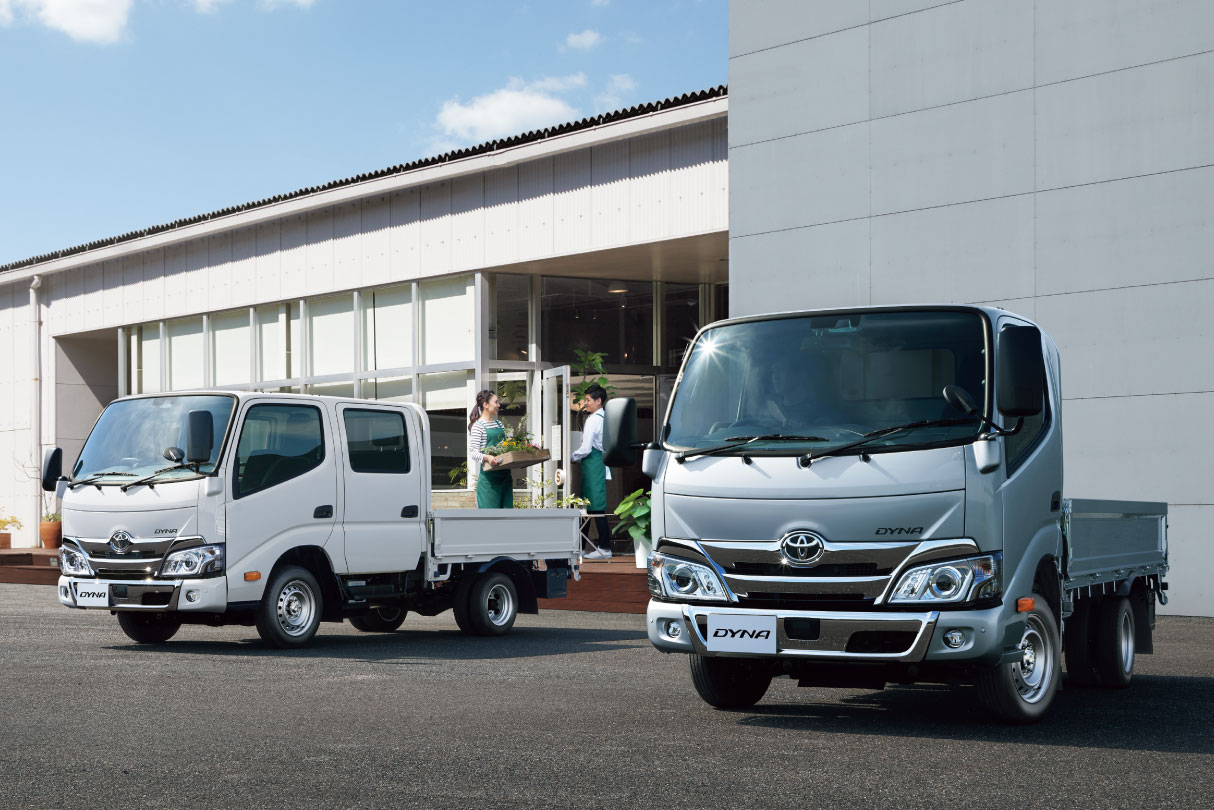 写真右はワイドキャブ・ロングデッキ・フルジャストロー・2.0トン積・ディーゼルハイブリッド車。“Gパッケージ”装着車。ボディカラーのシルバーメタリック<199>はメーカーオプション。 車型番号 93