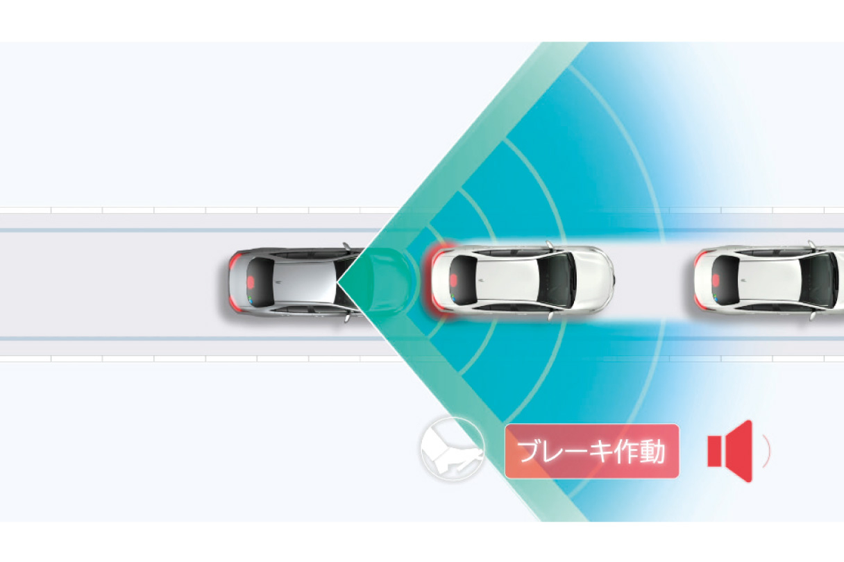 前方の車両や歩行者(昼夜)、自転車運転者(昼夜)、自動二輪車(昼)をミリ波レーダーと単眼カメラで検出。警報ブザーとマルチインフォメーションディスプレイ表示で衝突の可能性を知らせ、ブレーキを踏めた場合はプリクラッシュブレーキアシスト。ブレーキを踏めなかった場合はプリクラッシュブレーキを作動させ、衝突回避または被害軽減をサポートします。プリクラッシュブレーキは歩行者や自転車運転者に対しては自車が約5〜80km/hの速度域で作動し、衝突回避または被害軽減をサポートします。また、車両や自動二輪車に対しては自車が約5km/h以上で作動し、衝突回避または被害軽減をサポートします。