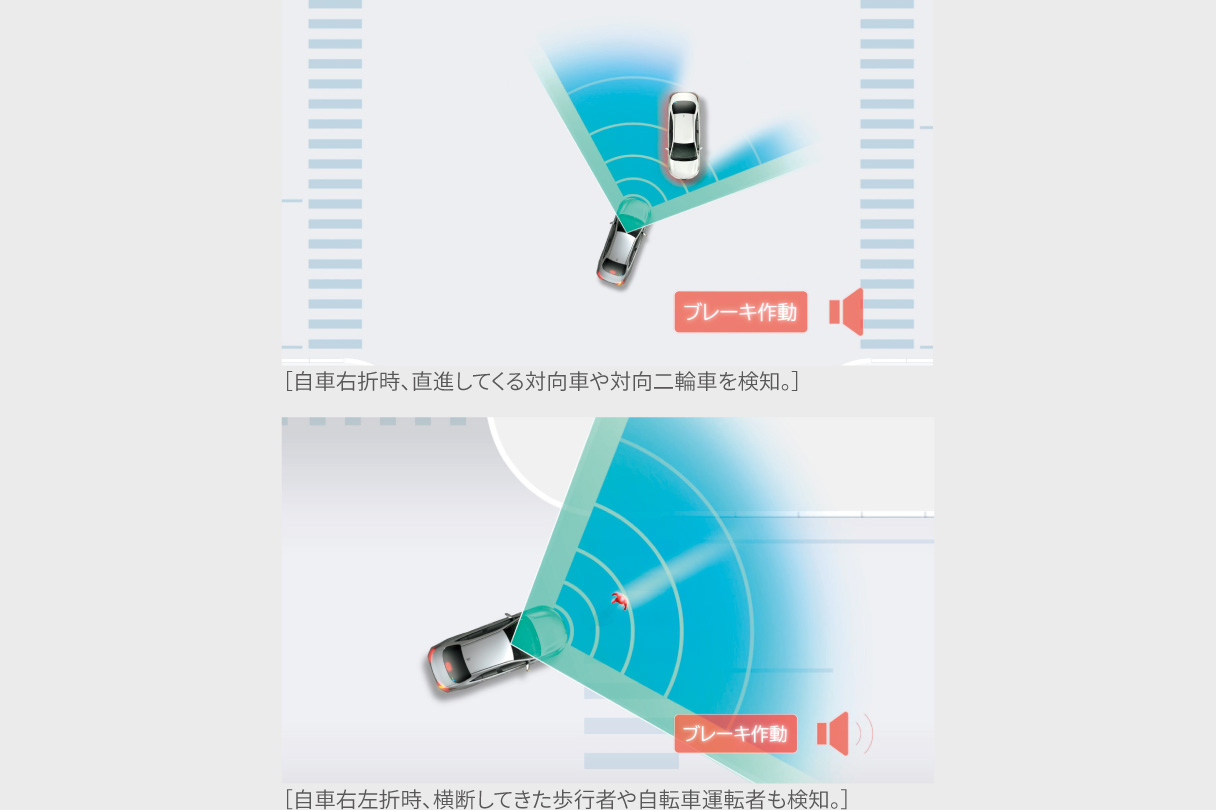 交差点右折時に直進してくる対向車および右左折時に横断してくる歩行者や自転車運転者をミリ波レーダーと単眼カメラで検出。交差点での検知は隣接2レーンまでの対向車に作動領域を拡大しています。ブザーと表示で衝突の可能性を知らせると同時に、プリクラッシュブレーキを作動。衝突回避または被害軽減をサポートします。