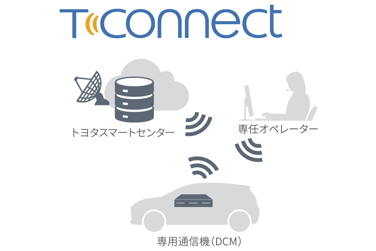 専用通信機(DCM)を使って、クルマがトヨタスマートセンターとつながるT-Connectサービスがご利用いただけます。もしもの体調不良や事故、走行中の様々なトラブルや車両の不調にも、24時間365日いつでも応える安心をお届けします。