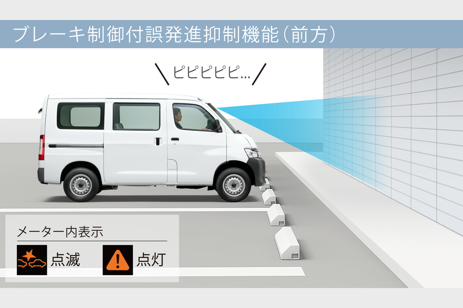 約10km/h以下で障害物を認識後、踏み間違い(アクセルペダルを強く踏み込んだ場合)を判定してエンジン出力を抑制し、ブザー音とメーター内表示で警告。さらに障害物に衝突する危険性があるとシステムが判断するとブレーキ制御が作動します。