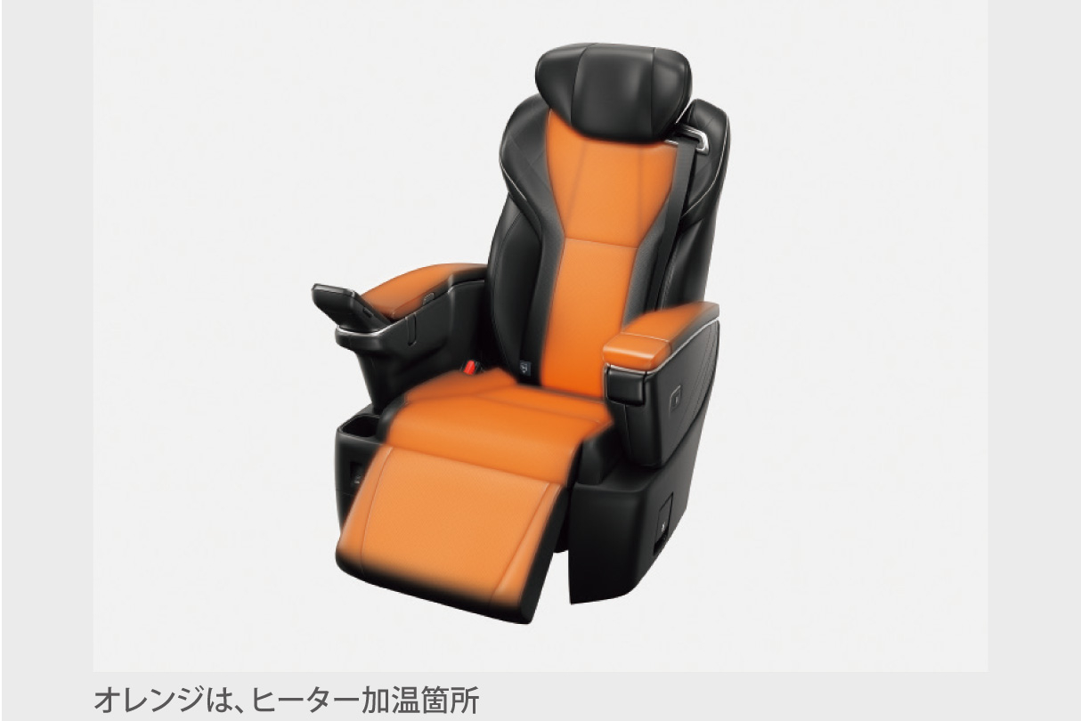 エグゼクティブラウンジシートには、トヨタとして初めてアームレストとオットマンに快適温熱シートの加温範囲を拡大しヒーターを搭載。乗員の快適性を高めます。