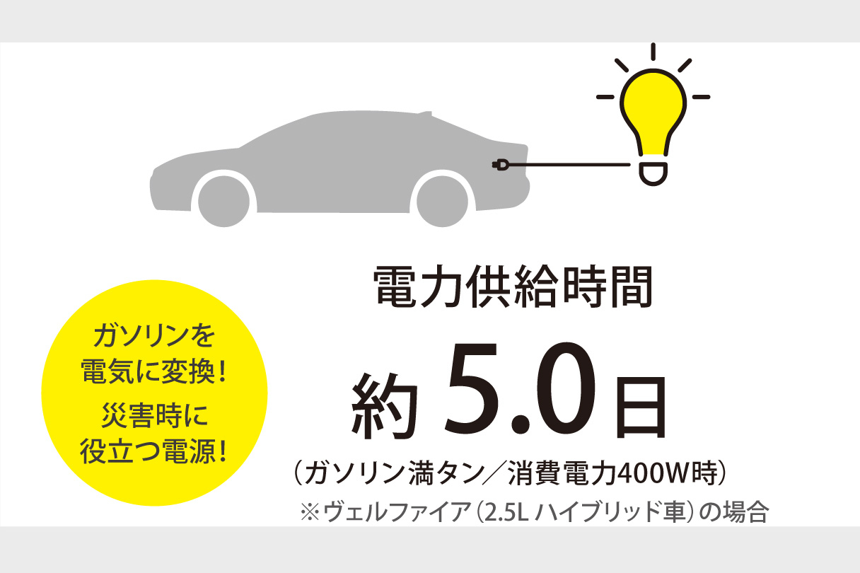 駆動用電池の残量減少などにより、自動でエンジンが始動し、充電を行います。一部の自治体では、駐車または停車中にエンジンを始動した場合、条例にふれる可能性があります。アクセサリーコンセント、非常時給電システムの使用については関係する自治体に確認した上で、適切に使用してください。