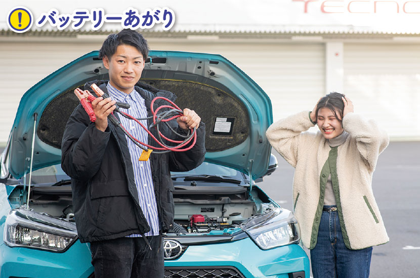 冬に起きやすいトラブルの筆頭はバッテリーあがりです。外気温が下がる冬場はバッテリーのパフォーマンスも下がりがち。バッテリーがあがるとエンジンがかからなくなってしまうので、注意が必要です。