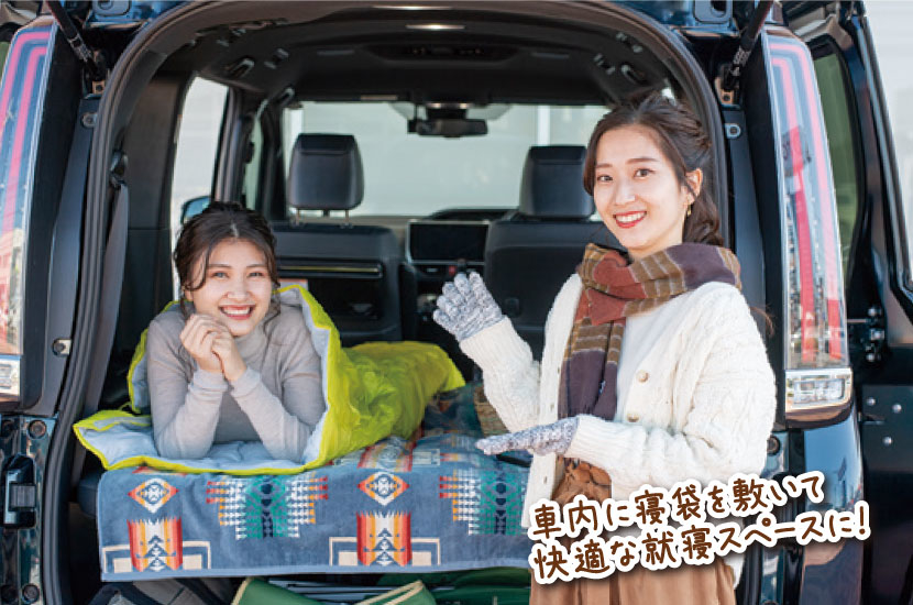※エンジンをかけたまま就寝すると、排気ガスが車内に入り込み一酸化炭素中毒の恐れがありますので、おやすみの際は必ずエンジンを停止してください。また、車内での燃焼器具の使用は火災だけでなく一酸化炭素中毒の恐れがありますので、絶対に使用しないでください。