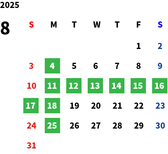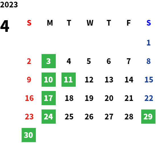 月曜定休日を基本としておりますが、不規則でお休みを頂く場合もございます。定休日の詳細は営業日カレンダーをご参照ください。