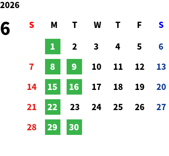月曜定休日を基本としておりますが、不規則でお休みを頂く場合もございます。定休日の詳細は営業日カレンダーをご参照ください。